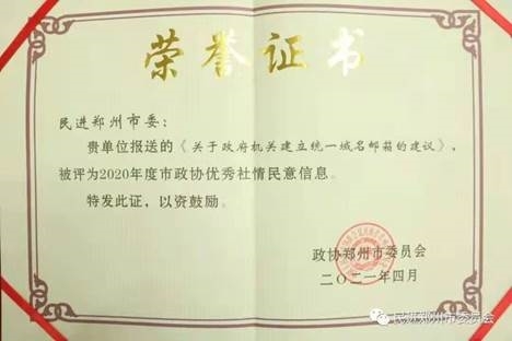 2021年4月16日,郑州市政协召开全市政协反映社情民意信息工作会议,传达全国政协办公厅2020年度反映社情民意信息工作座谈会、全省政协反映社情民意信息工作会议精神,并对市政协2020年度反映社情民意信息工作先进工作单位、先进个人和优秀社情民意信息进行通报表彰。民进郑州师范学院支部主委雷志华同志荣获“反映社情民意信息工作先进个人”称号,其撰写的“关于政府机关建立统一域名邮箱的建议”被评为2020年郑州市政协优秀社情民意信息、民进河南省委会2020年度参政议政优秀成果,同时该社情民意信息被全国政协采用。