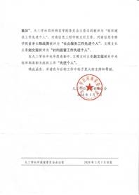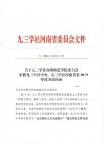 2019年九三学社郑州师范学院委员会围绕九三学社中央“思想上坚定、履职上坚实、组织上坚强”的中国特色社会主义参政党建设目标,在我校党委的大力支持和指导下,尽心履职,开拓创新,被九三学社河南省委授予“社会服务工作先进集体”“理论研究工作先进集体”等荣誉称号,主委马莉同志被评为“组织建设工作先进个人”称号。