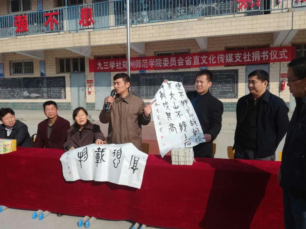 九三学社郑州师范学院委员会十分关心贫困农村孩子的学习生活情况。在夏丽华主委、吕金国副主委的积极号召下,社员们热情响应捐书捐物,共捐赠图书600余册,价值10000元左右;体育用品十箱价值30000多元。吕金国先生还向学校赠送了书法作品,向孩子们介绍中国传统书画文化,鼓励孩子们好好学习。
