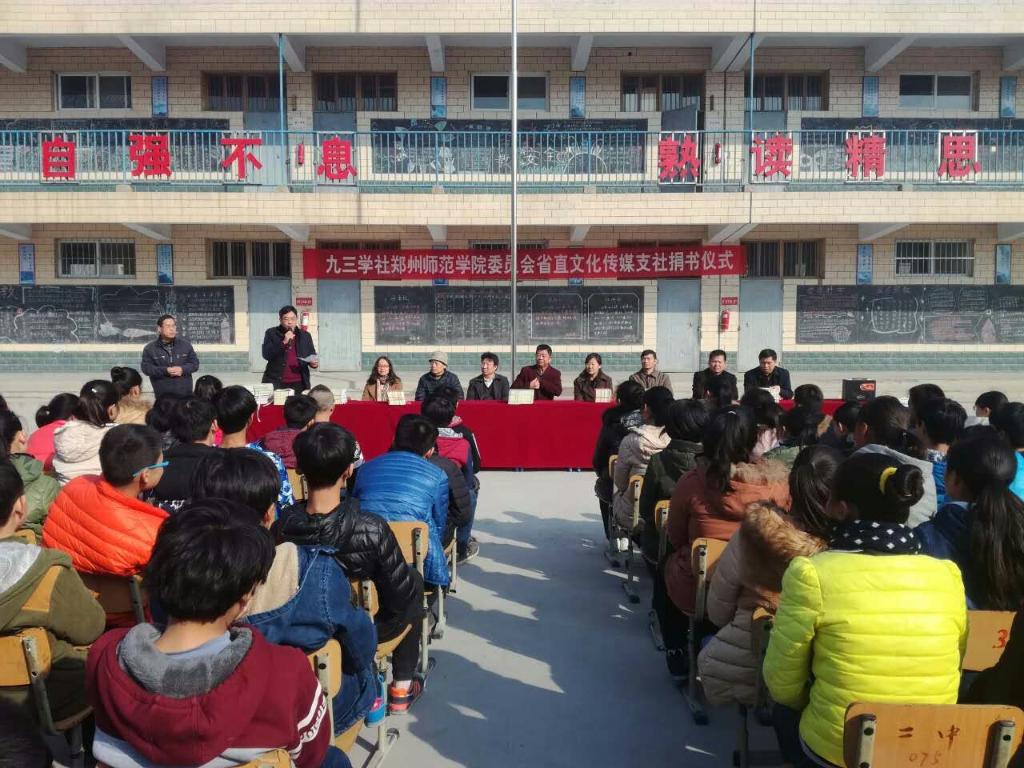 2016年12月8日,九三学社郑州师范学院委员会主委夏丽华、九三学社省直文化传媒支社主委吕金国带领郑电波等骨干社员一行6人,在郑州师范学院驻村干部、汜水镇新沟村第一书记焦建鹏,荥阳市教育局领导陪同下,来到了荥阳市汜水镇第一初级中学,为偏远贫困地区的孩子送来了图书和体育用品。