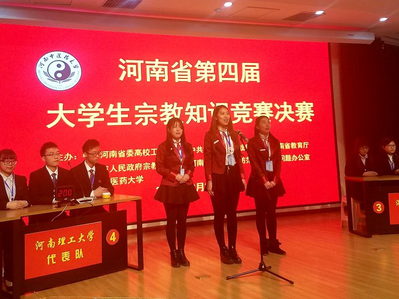 由省委高校工委、省委统战部、省教育厅、省人民政府宗教事业局、省人民政府防范处理邪教问题办公室主办的河南省大学生宗教知识竞赛,已经连续举办了四届。我校每年都认真组织落实校内初赛,选拔优秀选手挺进决赛,并取得了一年比一年优异的成绩。真正把这项赛事举办成了我校的常规教育活动,参与面广、受到教育和锻炼的学生多,使更多的学生认识到掌握宗教知识的重要性,增强了马克思主义宗教观和学法遵法守法用法意识,提高了正确认识和对待宗教问题的能力。