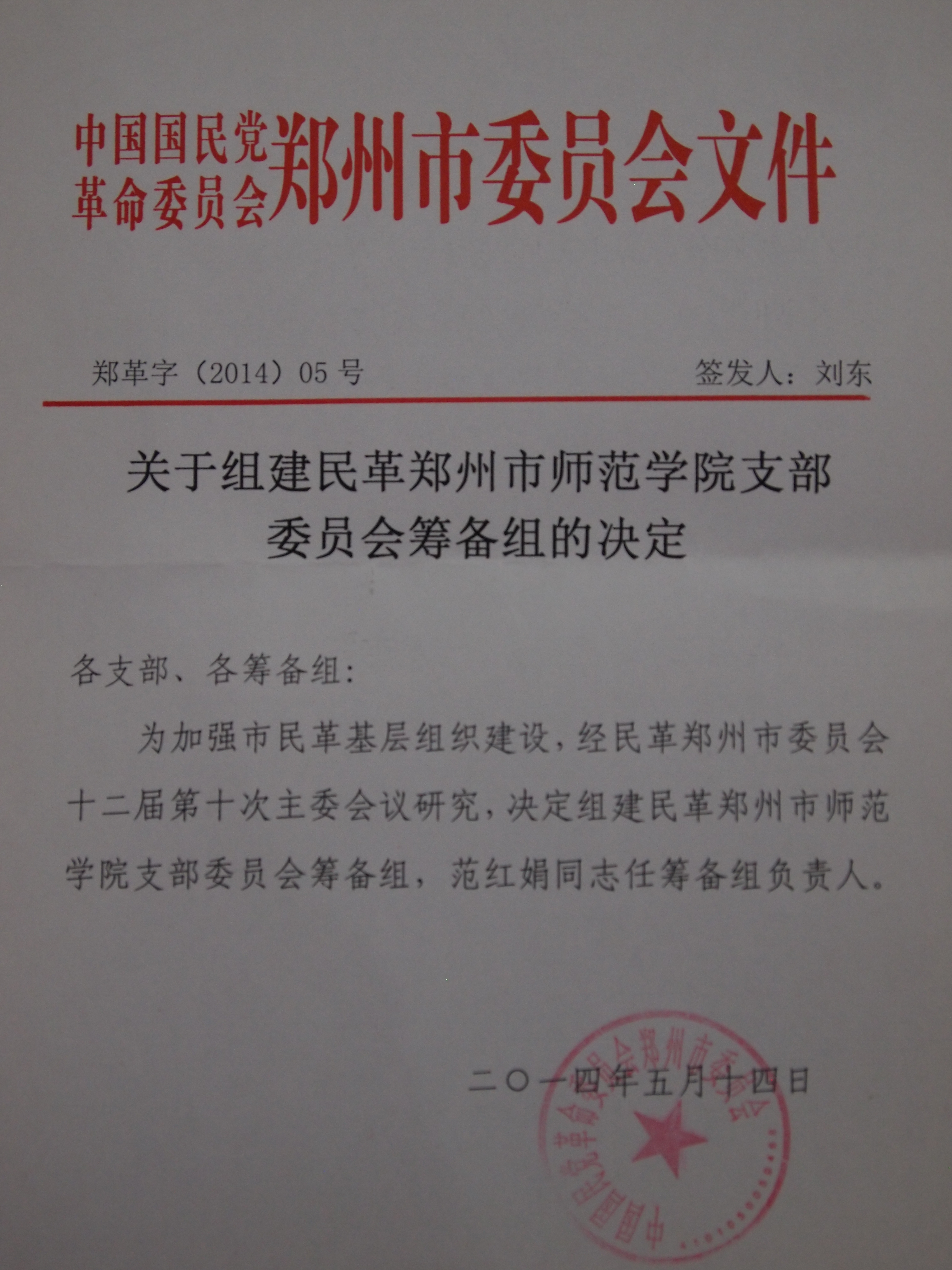 2014年5月19日下午,民革郑州师范学院支部筹备组成立大会在郑州师范学院图书馆10楼会议室召开。民革郑州市委副主委张自福,民革郑州市委秘书长张路,民革郑州市委组织处处长郭存参加会议,郑州师范学院统战部部长帖永顺到会表示祝贺。