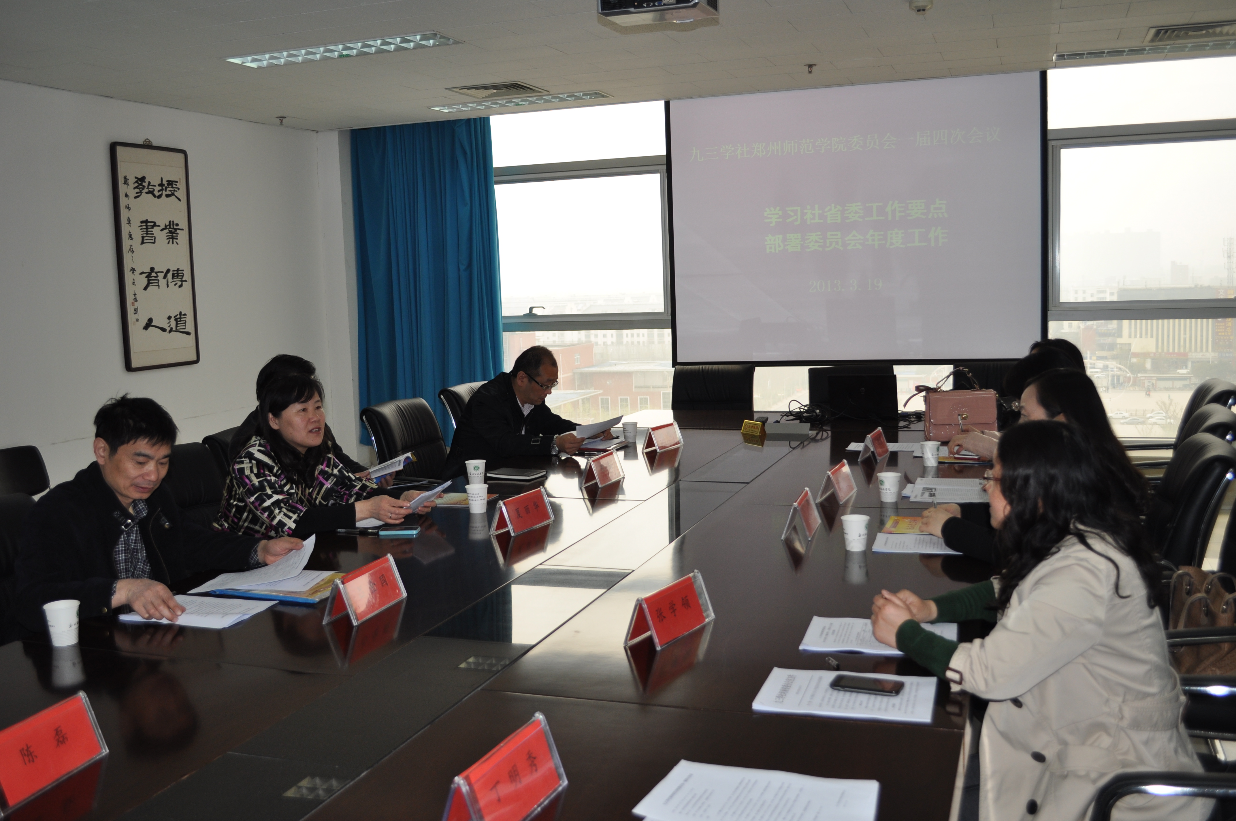 2013年3月19日上午,九三学社郑州师范学院委员会一届四次会议在郑州师范学院图书馆八楼会议室召开。九三学社郑州师范学院委员会全体成员参加了会议,郑州师范学院统战部部长帖永顺对各位委员的到来表示欢迎。